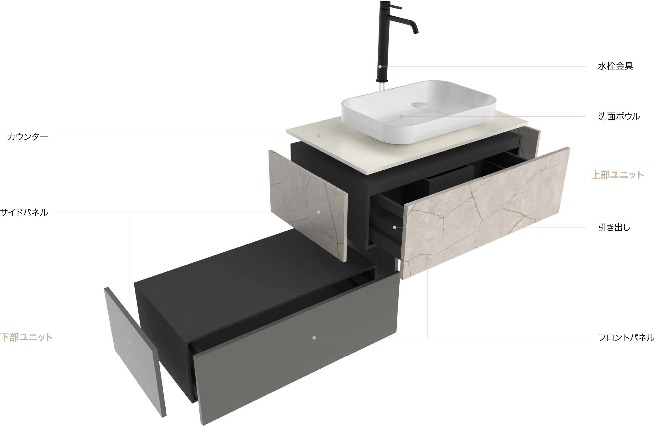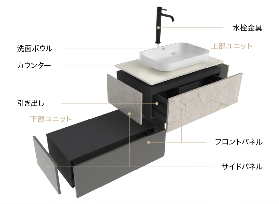 洗面ボウルやカウンター、水栓金具などを